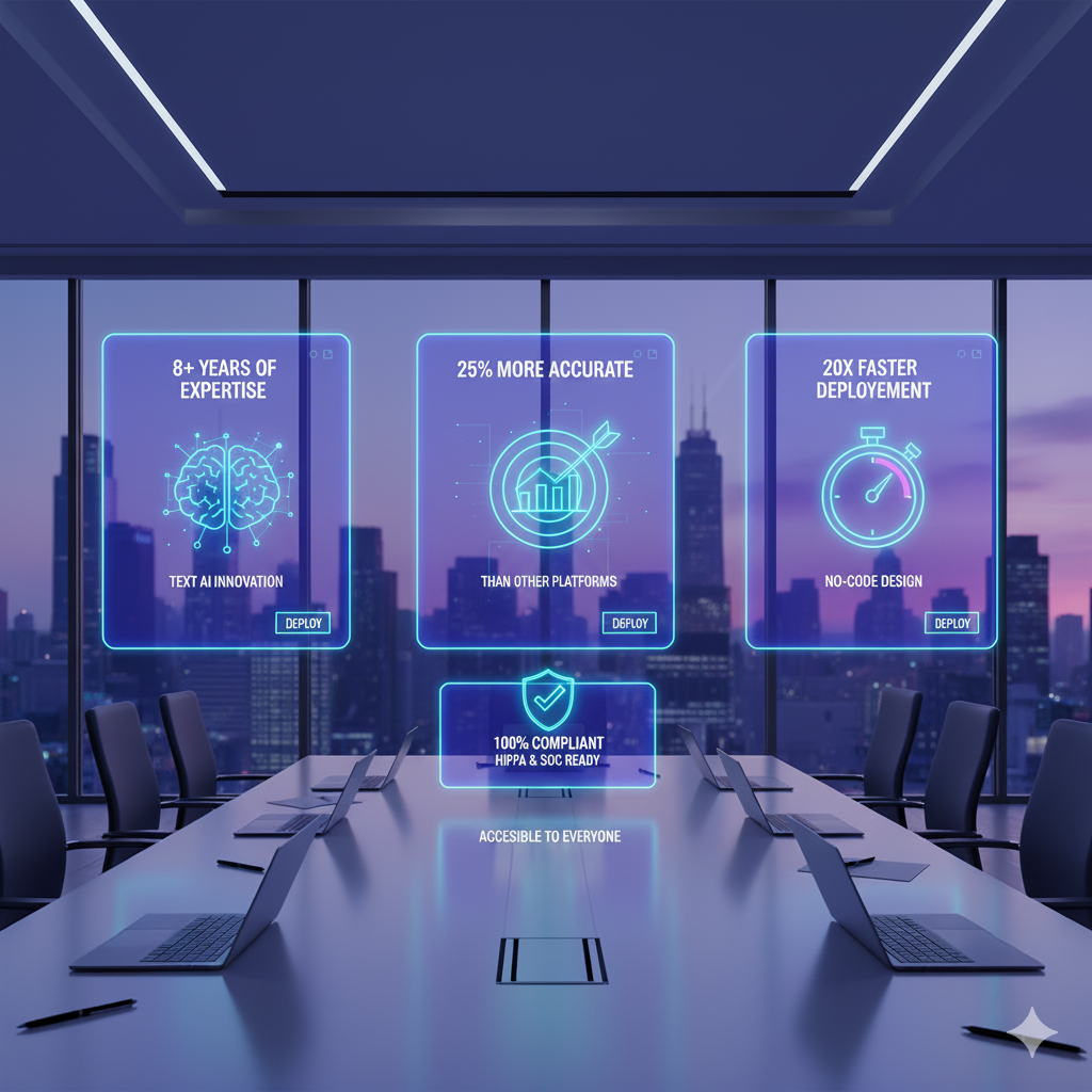The No-Code AI Studio encapsulates over 8 years of pioneering work in Text AI, bringing together everything we’ve learned about accuracy, compliance, and scalability into one powerful platform. Designed to make enterprise-grade AI accessible, it allows teams to build advanced AI applications—without writing a single line of code—through an intuitive drag-and-drop interface.